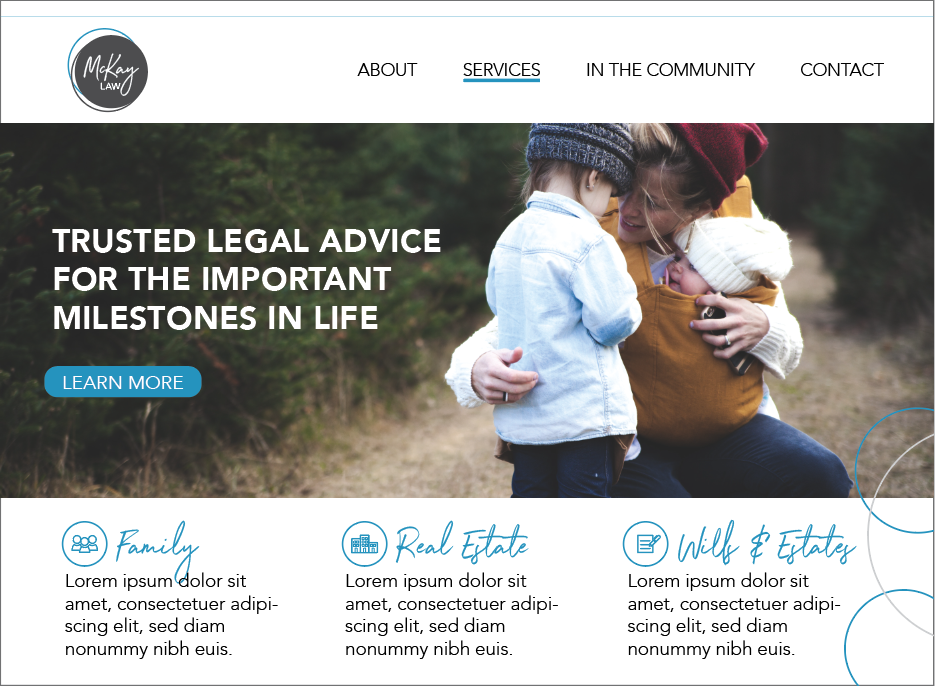 The circles represent a community coming together, but are off-centre because no one’s journey through life is perfect. However, McKay Law is there at the centre when you need them.